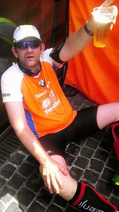 Nach kurzen verschnaufen, ging es wieder zu den Verpflegungsständen, dieses Mal ein bißchen ausführlicher. Ich genehmigte mir Wasser (auch zum abkühlen des Körpers) und als Highlight gab es ein gekühltes Erdinger-Alkoholfrei. Meinen Edelfan Sebastian besorgte ich noch eine Laugenstange und so gingen wir gut gestärkt zum Meeting-Point wo Nadine schon auf uns wartete.