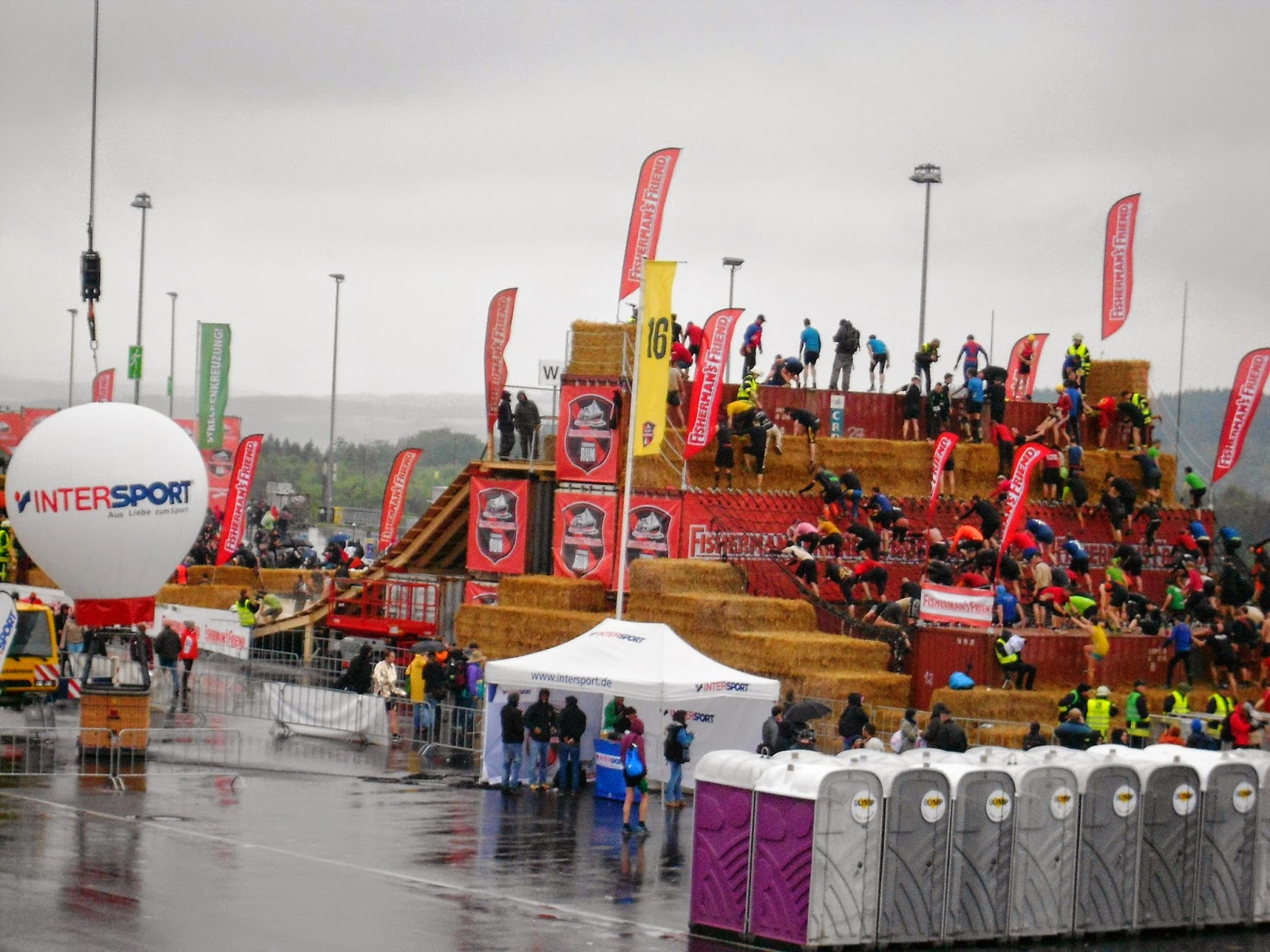 Jetzt kam mein Respekthinderniss, nämlich Hindernis 16, MOUNT BUTTMORE. Respekt daher, ich habe Höhenangst. Aber man ist so gepusht mit Adrenalin, am Ende war das Hindernis nur GEIL! Es bestand aus insgesamt 3 Stufen. Stufe 1: Mit Stufen aus Heuballen ging es auf einen Überseecontainer, von dort auf Stufe 2 (2 übereinander gestapelten Container) mit Kletternetzen. Stufe 3 waren 3 aufeinander gestapelten Überseecontainer wiederum mit Heuballenstufen.