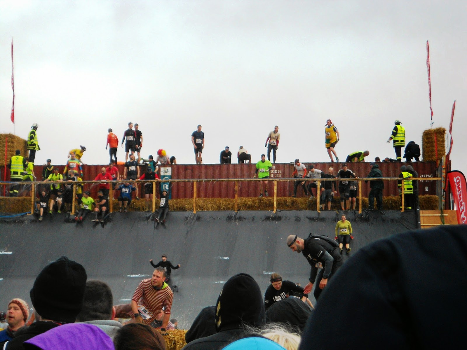 verschiedene Hügel und die Südwand. Die Südwand war auch gleichzeitig die INTERSPORT Bergwertung. Der Gewinner konnte ein T-Shirt gewinnen. Natürlich lagen dort auch wieder Reifen und Strohballen "im Weg". Wir gingen den Berg im lockeren leichten Tempo an, und verzichteten auf die Bergwertung. Oben angekommen war zuerst mal ne Pinkelpause angesagt. Nach dieser kurzen Pause liefen wir mit einem schnelleren Tempo weiter, damit wir nicht wieder auskühlten. Es folgte das erste Bad, Hindernis 6, BUTT SPENCER. Eine Wasserrutsche, schnell hingesetzt und abwärts. Beim Eintauchen ins Wasser, dieses natürlich in jede Öffnung bekommen. Bei der Wassertemperatur, welche wärmer war als die Außentemperatur, noch kurz durchgepustet und wieder raus aus dem Becken. Weiter über die Rennstrecke und durchs Kiesbett zum