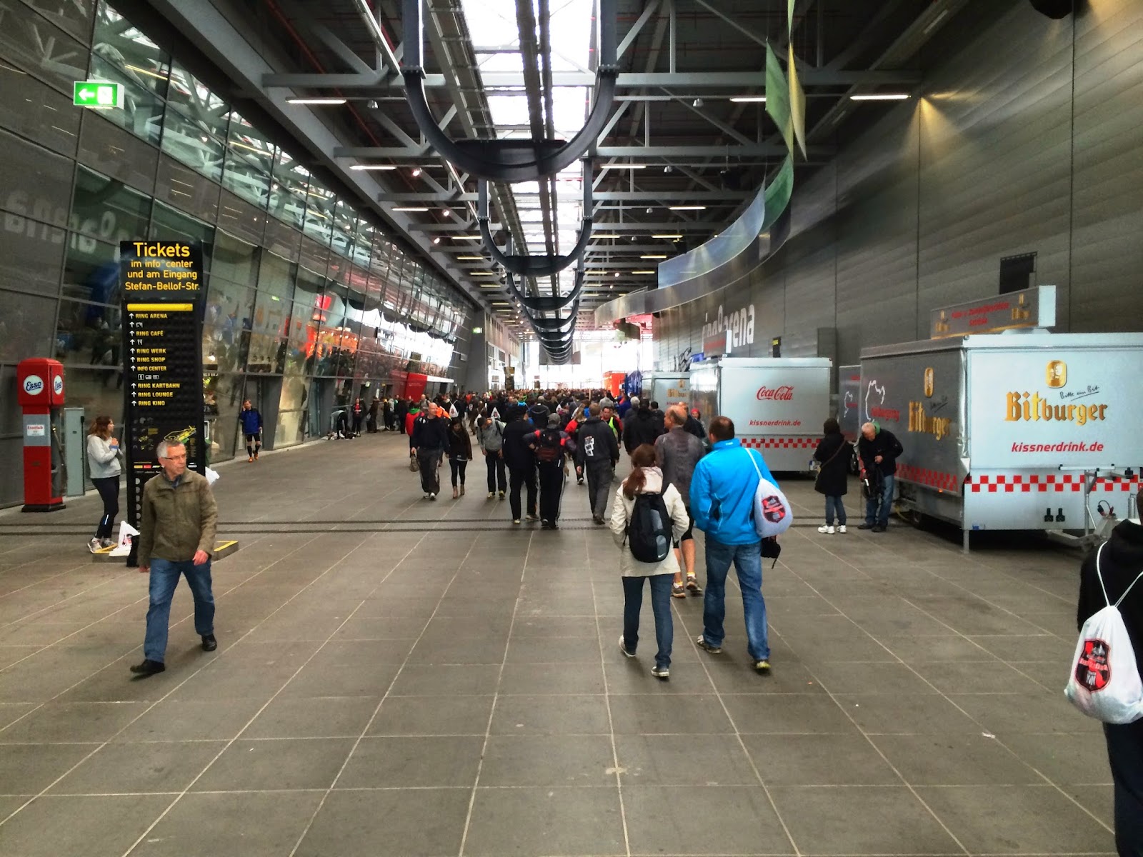 Heute war richtig Betrieb im ring°boulevard gegenüber gestern. Entspanntes Bummeln sieht anders aus. Da es ja nichts Neues gibt, auch die Hoodies gab es immer noch nicht in XXL, suchten wir uns einen Platz auf der Tribüne, damit Nadine und Sebastian gute Sicht für den Start hatten. In der Zwischenzeit rief mich Kerstin an und teilte mir mit, das sie jetzt auch im ring°boulevard sind. Ich ging hinunter zur Startnummernausgabe und traf mich dann mit Kerstin und Patrick. Wir beschlossen heute im Team zu laufen und machten