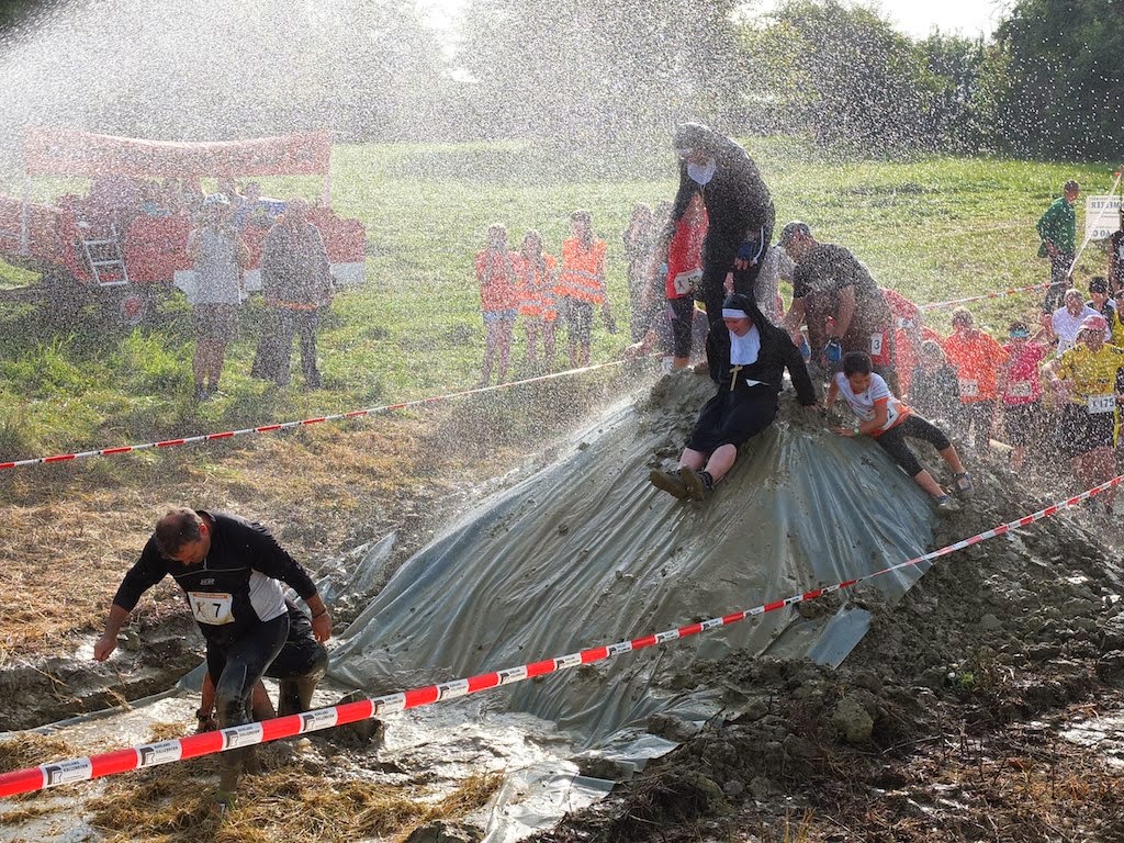Es waren laut meiner Uhr noch knappe 3 Kilometer bis ins Ziel und der nächste Anstieg wartete auf uns. Aber auch ein Verpflegungspunkt und das letzte Matschhindernis. Dieses war ein Matschloch von 20 Meter Länge, über dem Bauabsperrgitter lagen und von Strohballen umgrenzt war. Wir mussten zuerst über die Strohballen, dann kriechend durch das Matschloch und über den nächsten Strohballen wieder raus. Damit es noch angenehmer war, berieselte uns die örtliche Feuerwehr noch ordentlich mit Wasser. Damit Mutter Oberin besser über den Strohballen kam, kniete ich mich noch auf alle viere und sie konnte mich als Tritt benutzen. Ein Spaß für die Zuschauer.