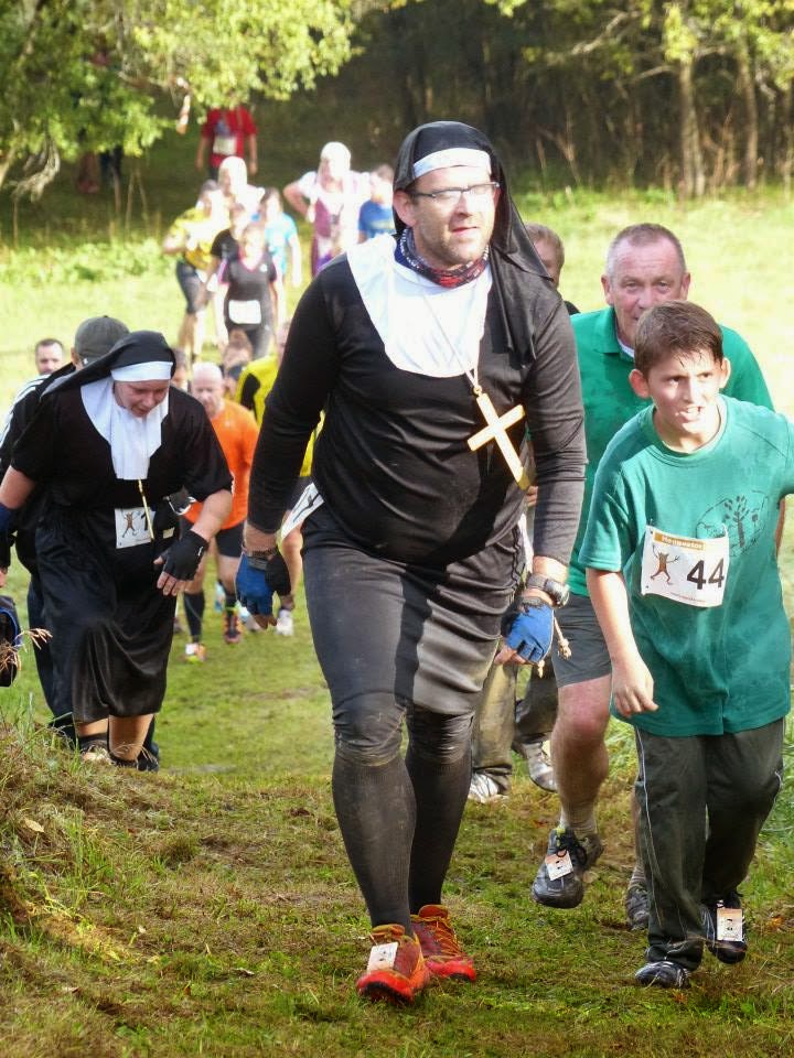 Da es für uns nur um den Spaß ging, beschlossen wir bereits im Vorfeld, verkleidet zu laufen. Kersten lief in seiner StrongmanRun erprobten Giraffenhose mit Schwanz. Monja und ich liefen als Nonnen.