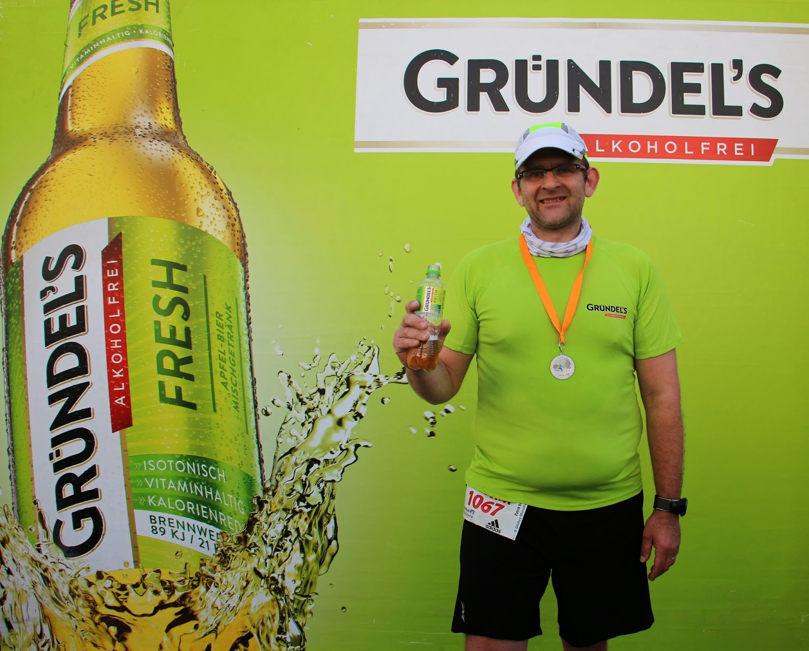 Im Zielbereich habe ich noch ein Schokobrötchen und ein Gründels Fresh zu mir genommen und mit Nadine noch einen Treffpunkt ausgemacht. Dann ging es zum Fotoshooting mit meinem Gründels Fresh Presswurst-Shirt.