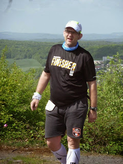 Ein tolles Gefühl. Noch eine Runde ums Gipfelkreuz und es ging wieder die Halde hinunter. Wir verließen die Ritterstraße und es ging weiter durch den Riegelsberger Wald. Bei Kilometer 7 überholte mich der erste Walker. Verdammt, mein Ziel nicht erreicht. Na ja macht nichts, es geht weiter. Wie gehabt: bergauf gehen, bergab laufen. Bei Kilometer 8 kam der Verpflegungspunkt. Ich füllte meinen Laufgurt wieder auf, trank noch Wasser und Isogetränk.