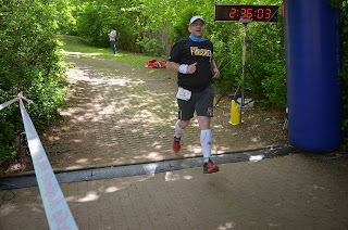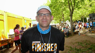 Da es auch bergab ging, lief ich jetzt auch meine schnellsten Kilometer. Ich hing mich an zwei Läufer und ließ mich von ihnen ziehen, angenehm. Zwei Kilometer vor dem Ziel sah ich nochmals den führenden Walker. Jetzt war meine Zeit gekommen. Ich überholte ihn und lief weiter. Yeah, mein Ziel erreiche ich doch noch. Ich hatte jedoch die Rechnung ohne die Steckeenführung gemacht. Kurz vorm Ziel ging es wieder bergauf mit Stufen. Schnelles gehen war angesagt und der Atem des Walkers im Nacken spürbar. Zum Glück ging es die letzetn 200 Meter zum Ziel wieder hinunter. Ich zog an. Ziel erreicht. Meine Zeit lag bei 1:41:31,9 Stunde, super.